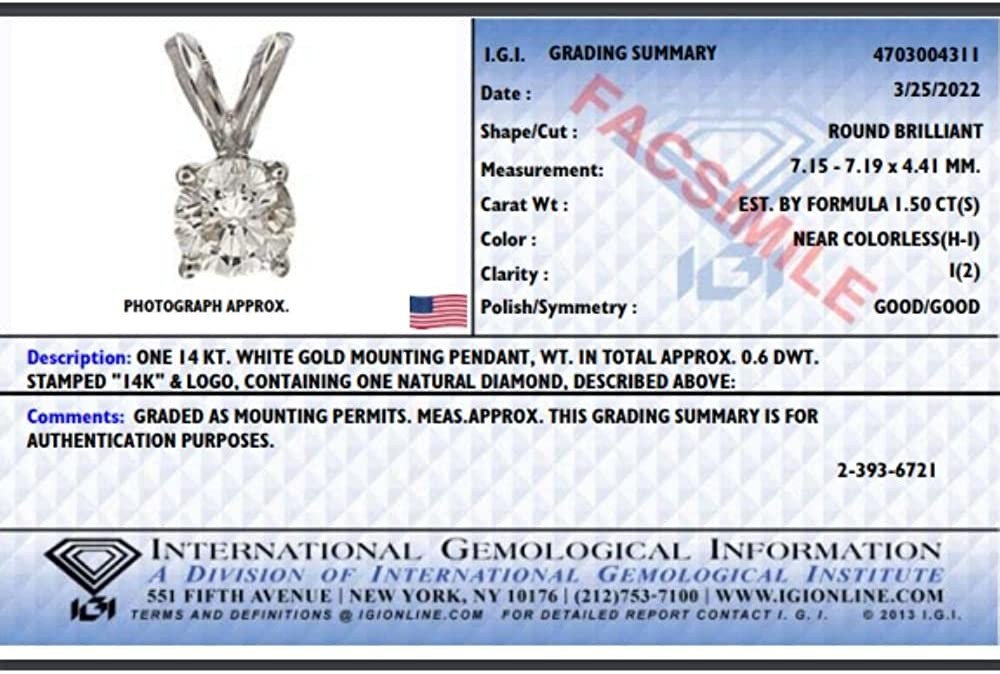 Mặt dây chuyền kim cương tự nhiên được chứng nhận 1.50ct HI/I2 Solitaire Dây chuyền vàng trắng 14k