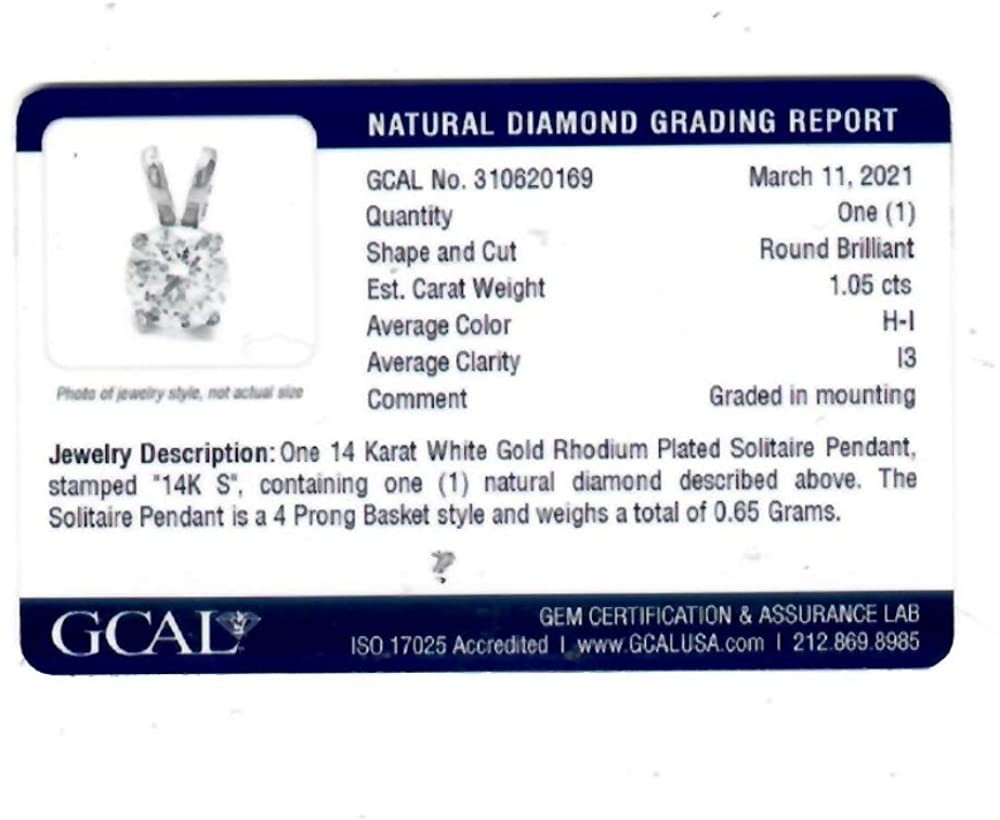 Dây chuyền Mặt dây chuyền Kim cương Solitaire được Chứng nhận 1Ct bằng Vàng trắng HI/I2-3