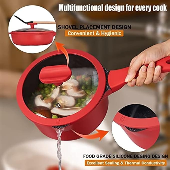 pots and pans set are made of high-temperature die-casting, making the cooking pots with a thicker body, and reinforced with a wobble-free base for extra strength and heating.