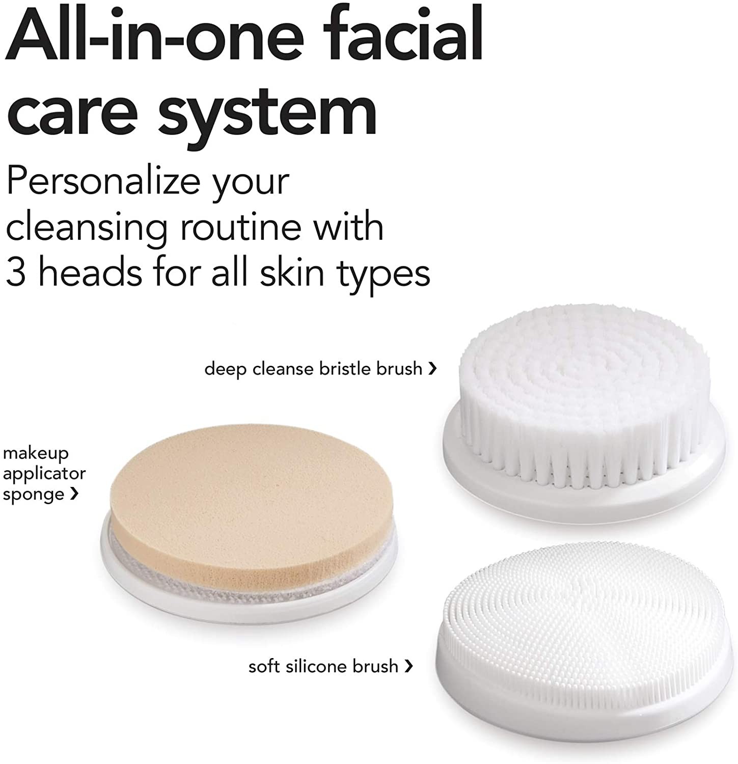 Hệ thống chăm sóc da mặt tất cả trong một: Máy rửa mặt điện bao gồm 3 đầu bàn chải cho mọi loại da: Một bàn chải silicon cho da khô và nhạy cảm, một bàn chải mềm cho da thường và da dầu và một miếng bọt biển trang điểm.