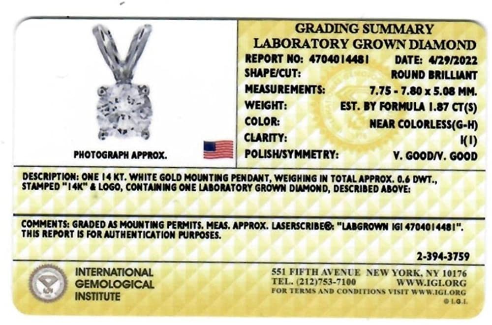 Mặt dây chuyền Solitaire kim cương được chứng nhận 1.87Ct Vàng trắng (GH/I1)