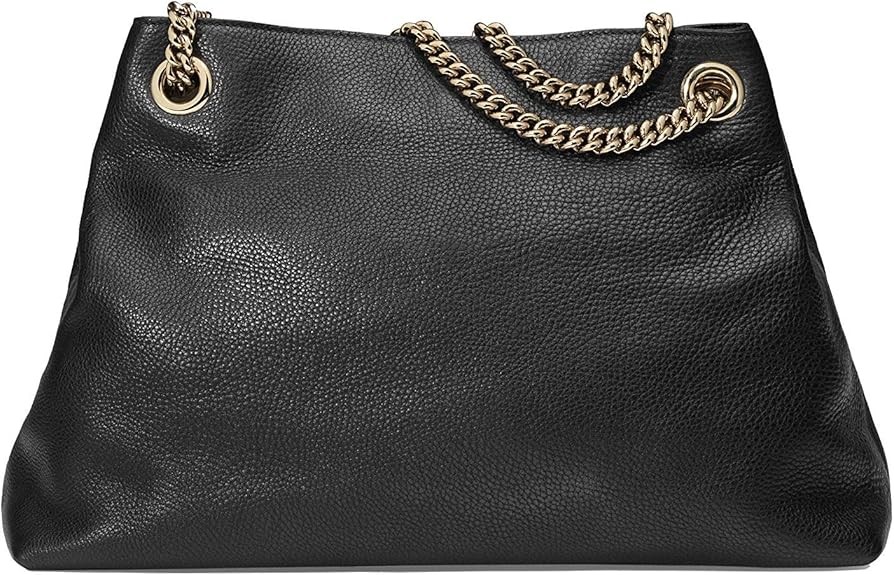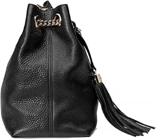 Details: Pebble leather. Light fine golden hardware. Double chain shoulder straps with leather shoulder pad; 7" drop. Detachable leather tassel.